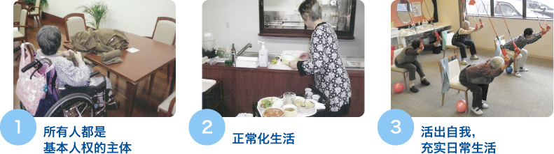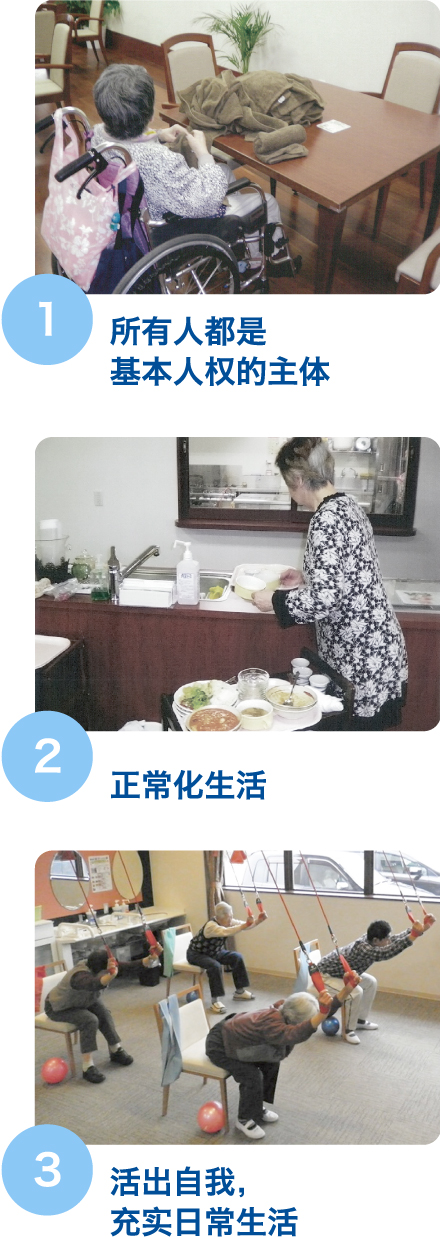 让长者按照自己的想法行动,是实现日常生活自立的基本要素。全部由护理员单方面决定,并将想法强加于长者,不能称之为好的养老服务。 工作人员代替长者完成他想做的事情是非常容易的,但这样一来就剥夺了长者做自己想做或能做的事情的自由。而且长此以往还会造成长者身体机能的废用性退化。 让长者最大限度发挥他一生获得的各种各样的能力,保持自己的个性,达成自我实现是我们的目标。自我实现是与生存价值、生存欲望是相关联的。 把自立支援的理念贯彻到生活的每一个细节中去,鼓励长者做自己想做的并且力所能及的事情,鼓励长者参加文娱社交活动,鼓励长者接受机能训练,能使长者的身体机能得以延续和改善,从而提升长者的生活质量,最大限度地延长长者的"健康寿命"。 |
